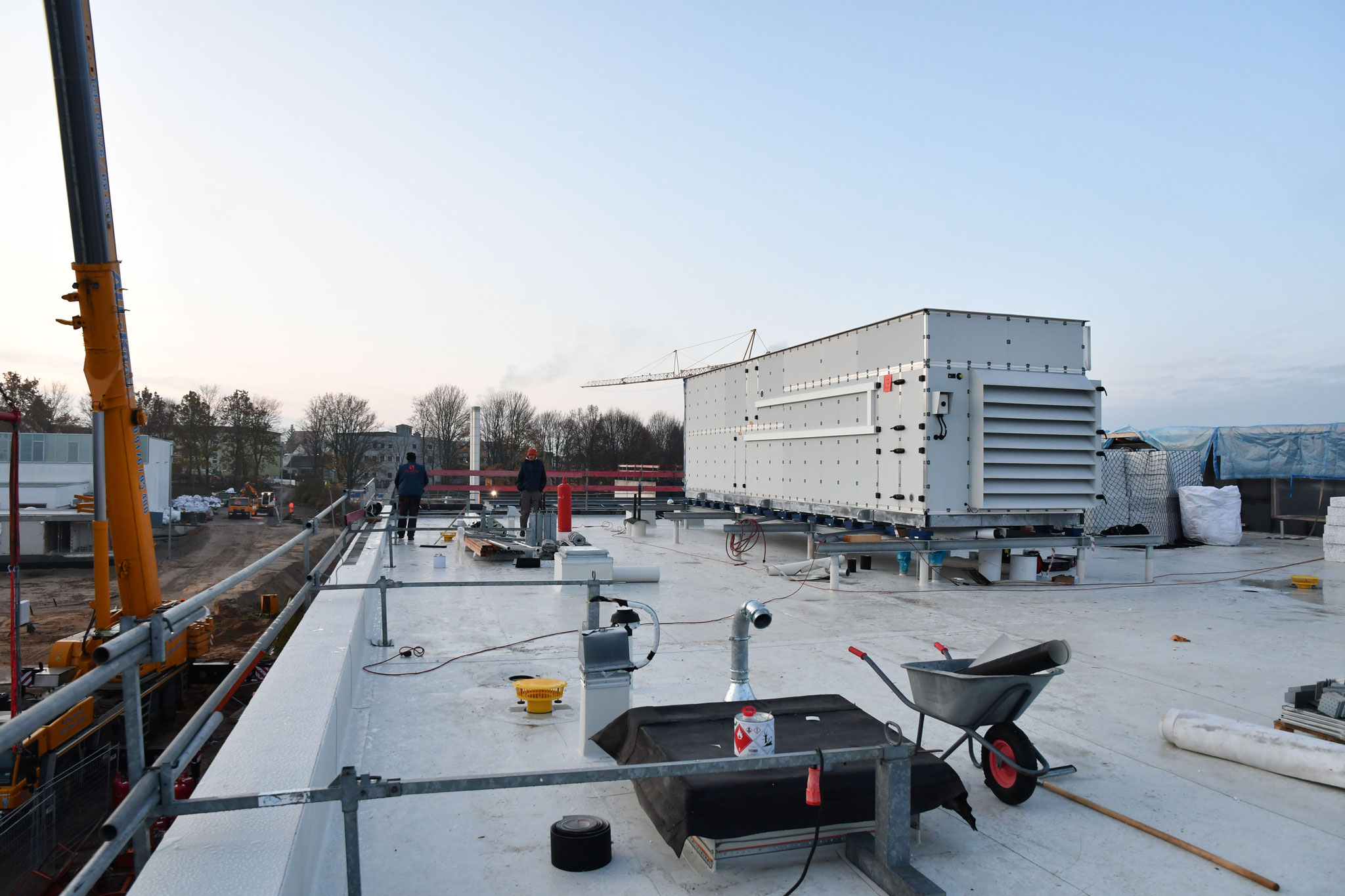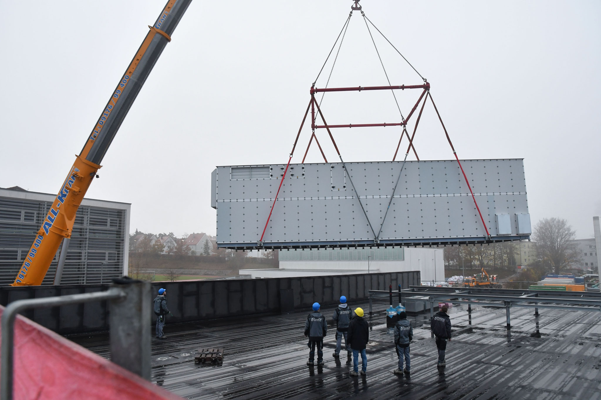 Die Geräte haben einen langen Weg hinter sich. Per Sondertransport wurden die 13 bzw. 14 Meter langen Aggregate aus dem österreichischen Lustenau am Bodensee bis nach Neumarkt transportiert. Gegen 7:00 Uhr hatten sie das Schlossbad erreicht. Vor Ort half ein Schwerlastkran, die jeweils bis zu 17,5 Tonnen schwere Fracht an den späteren Bestimmungsort zu heben. Alles erfolgte so reibungslos, dass die Arbeiten bereits am frühen Nachmittag planmäßig abgeschlossen werden konnten.