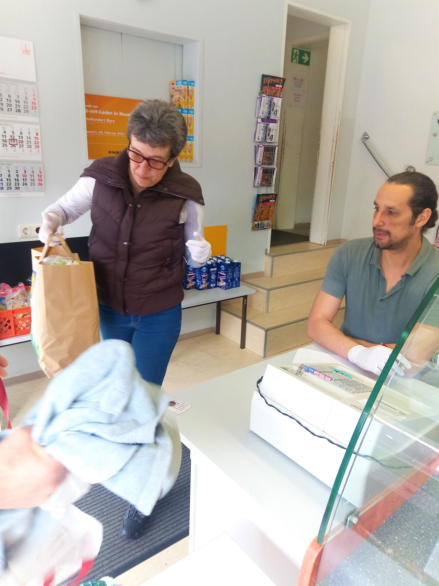 Die Lieferung der Waren erfolgt nicht mehr über den Haupt-, sondern über den Nebeneingang ohne Kundenverkehr. Alle Mitarbeitenden tragen Plastikhandschuhe und halten den geforderten Sicherheitsabstand. Außerdem werden regelmäßig alle Arbeitsflächen desinfiziert und natürlich die Hände gewaschen. Der Begegnungsbereich ist geschlossen und die Ausgabe von Kleidung ist gesperrt.