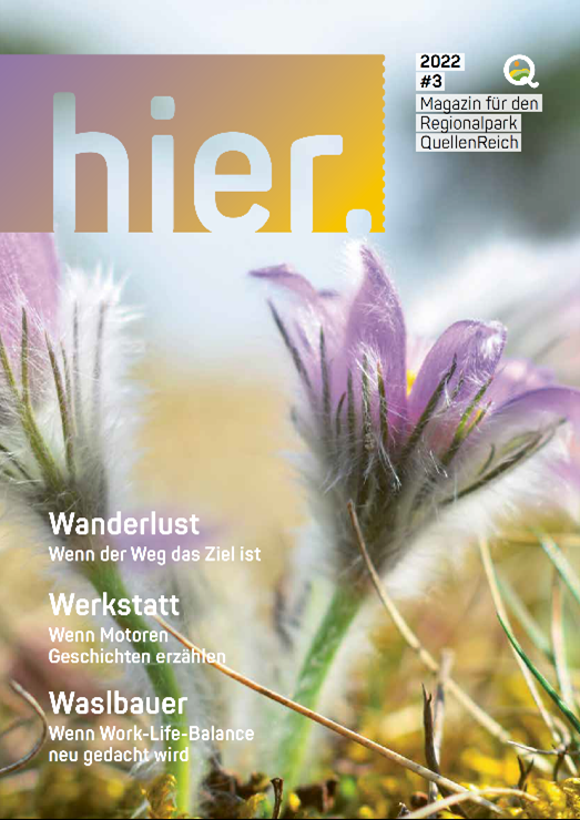 „Wir bieten auch in dieser neuen, mittlerweile dritten hier-Ausgabe viele spannende Themen und gute Tipps zum Wandern und Einkehren für die kommende Jahreszeit“, erklärt Werner Thumann, der Geschäftsführer des Regionalparks QuellenReich. „Uns war es wichtig, keine Werbebroschüre zu erstellen, sondern wir wollen uns der Identität unserer Region annähern. Und am besten lernt man die Unverwechselbarkeit einer Region durch Menschen, Orte und Geschichten kennen.“
